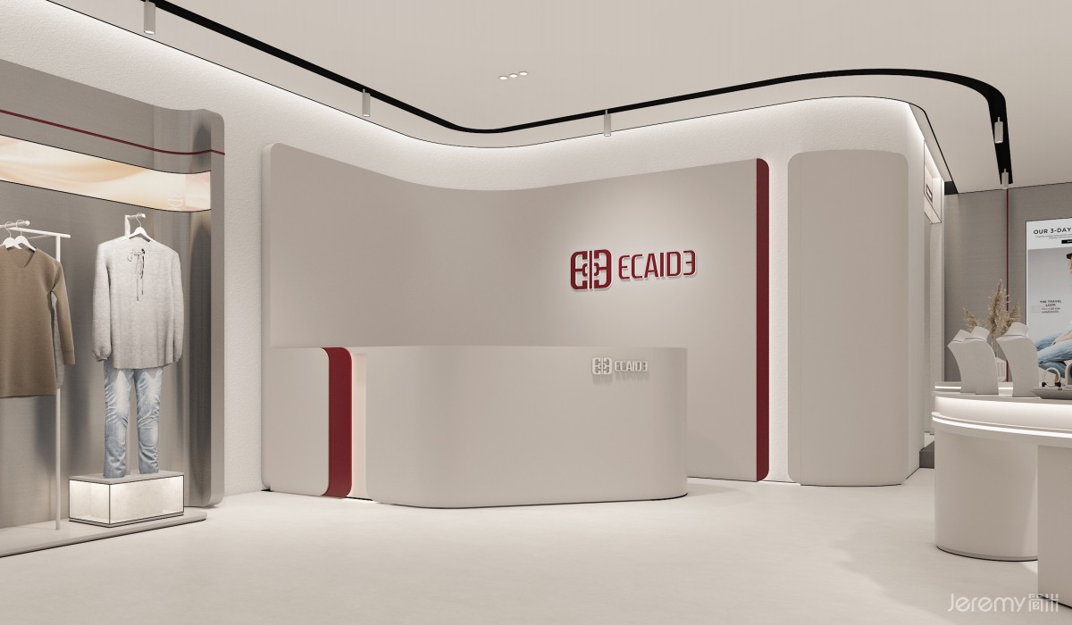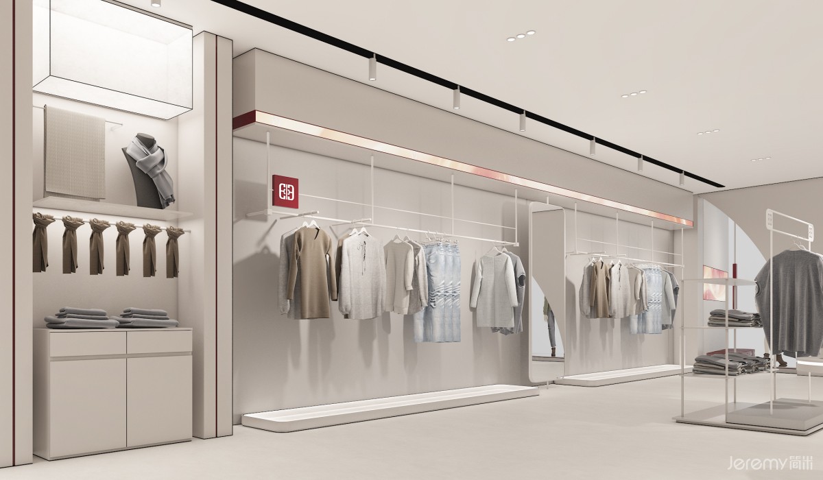 内部空间划分为产品展示、服务、休闲与 VIP 三大模块:靠墙陈列台与中岛展示区最大化利用空间,让顾客多维度浏览产品;入口模特展示台直观呈现穿搭效果,引导人流动线;饰品陈列架与陈列柜丰富展示维度,延伸品牌风格表达。收银区高效便捷,试衣间保障私密体验,休息椅与 VIP 专属区域则升级舒适感与尊贵感,全方位契合中高端客群需求。