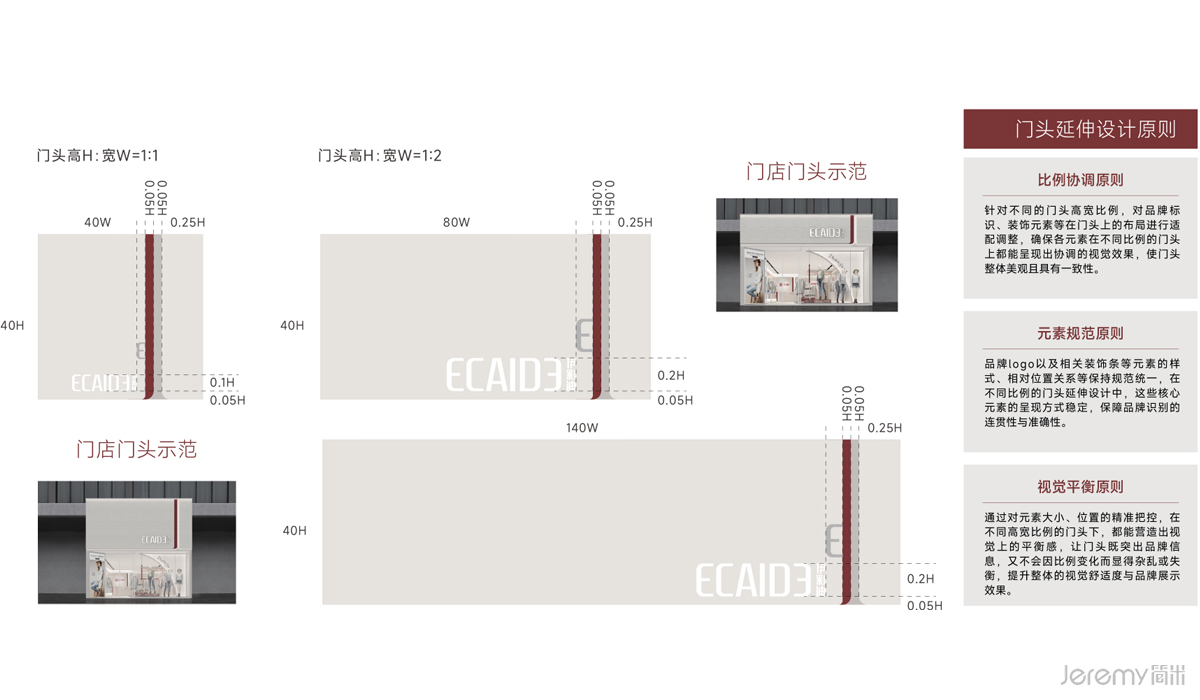 门店空间设计遵循 "比例协调、元素规范、视觉平衡" 三大原则,针对 1:1、1:2 等不同高宽比例的门头,实现品牌标识与装饰元素的灵活适配,确保视觉统一性与美观度。外立面采用白色 PU 阡陌石板、浅咖色碳晶板等材质,搭配 4000K 色温的防水柔性硅胶灯带与深灰色烤漆包边的树脂发光字,营造高级质感与辨识度。