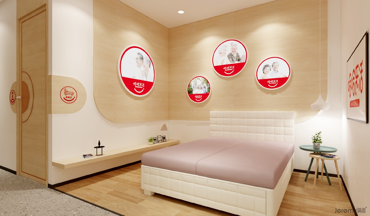 基础形态:提取品牌 LOGO 中的 “圆” 与 “方” 作为核心视觉元素 —— 圆形传递自然亲和感,消解人际隔阂;方形彰显专业严谨性,强化品牌信任度,二者形成 “柔与刚” 的平衡。材质语言:以木纹为核心肌理,搭配白色墙面与红色点缀,其中木纹象征温馨关怀,白色代表纯洁专注,红色(品牌色)注入活力热情,三重材质共同构建 “自然 - 专业 - 温暖” 的空间气质。
