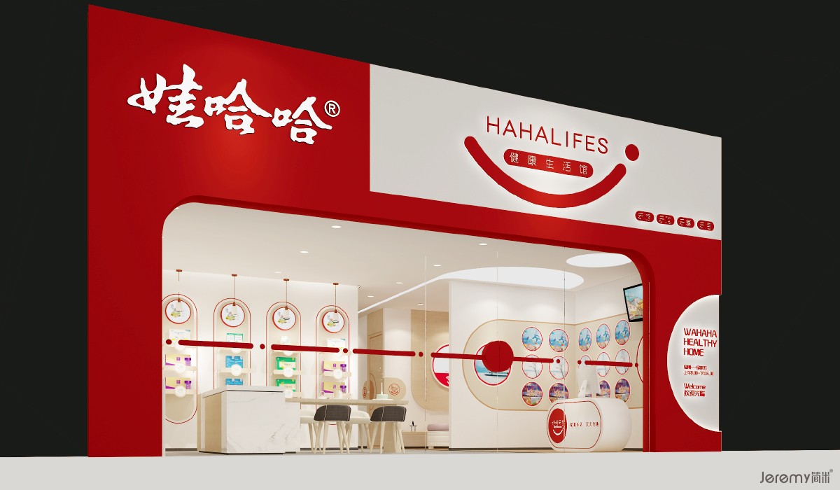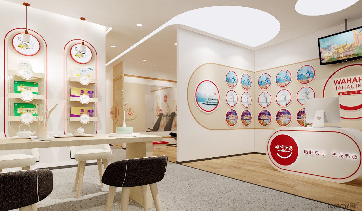 本次简米项目组打破传统健康馆 “产品推销” 的单一属性,将空间定义为社区老人健康生活集散中心,通过场景营造与情感链接,实现 “哈哈乐活 = 健康生活方式共同体” 的用户认知植入。设计核心逻辑为:先建立心理层面的关怀认同,再自然承接产品与服务转化,使销售成为情感体验的必然结果。