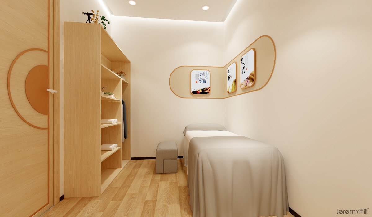 在顾问引导下,通过 “健康咨询→服务体验→老客分享” 的三重互动,让老人感知专业性与关怀度:理疗区以白色为主色调搭配圆形仪器造型,传递 “专业且温和” 的服务特质;床品区通过木纹陈列架展示睡眠产品,强化 “自然健康” 的产品认知。